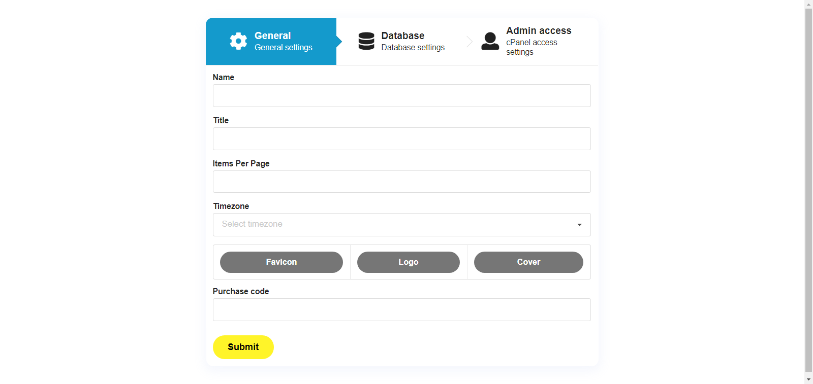 - To start the installation, access your website via the address bar, https://example.com , you will be redirected automatically to the installation form. Note: Some fields of the installation form will be stored in .env file (Database info, website url) while the rest will be stored in your database.