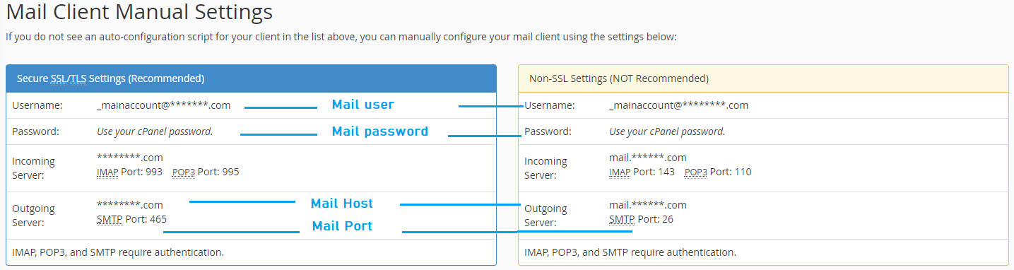 - Then, at the bottom, you have two choices, secure and none-secure configuration (settings), the password is the one you used to create the new email account or the cPanel one if it's the default email account.
