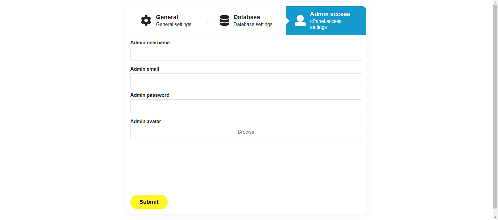 Note: the avatar is not required during the installation, you can upload one from the website's admin area.